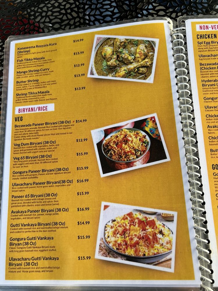 Hyderabadi style dum biryani.. Very long grain aromatic basmati rice cooked with veggies and more than 30 different spices for over an hour. Our signature dish and utterly delectable.